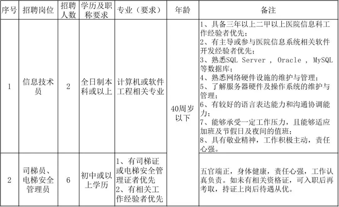 招聘對象:擬向社會公開招聘信息技術(shù)員2名、司梯員或電梯安全管理員6名(詳見招聘崗位)。